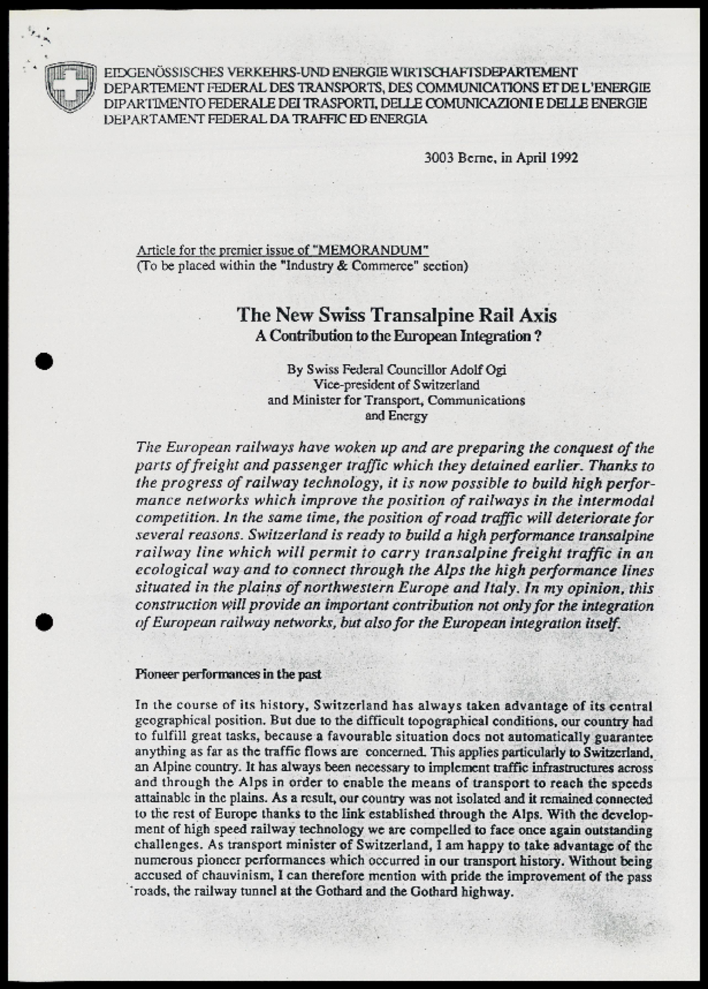 Adolf Ogi, The New Swiss Transalpine Rail Axis, April